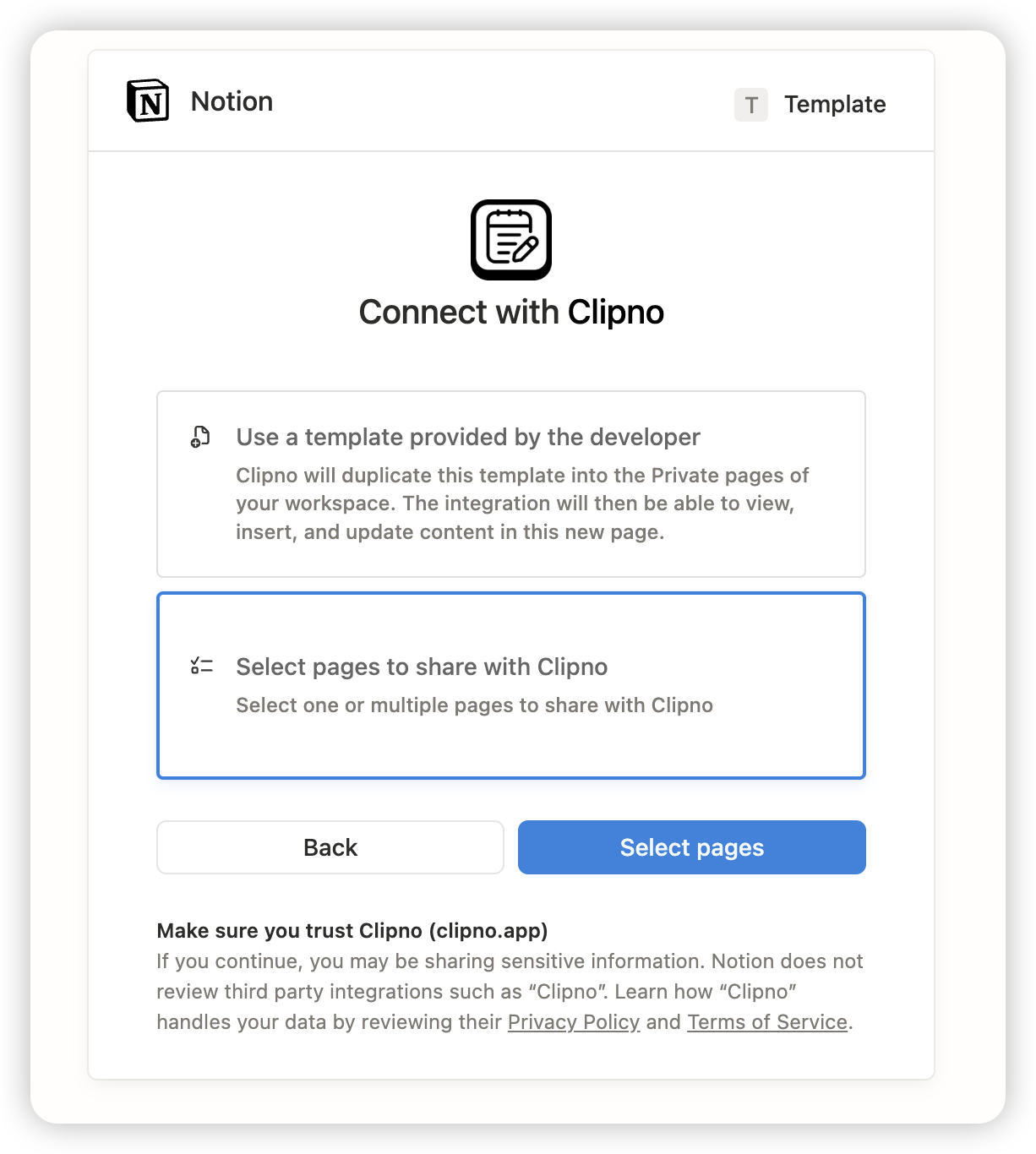 After logging into the extension, click Notion authorization → Next. On the authorization page, choose “Select your page” to use your own template.