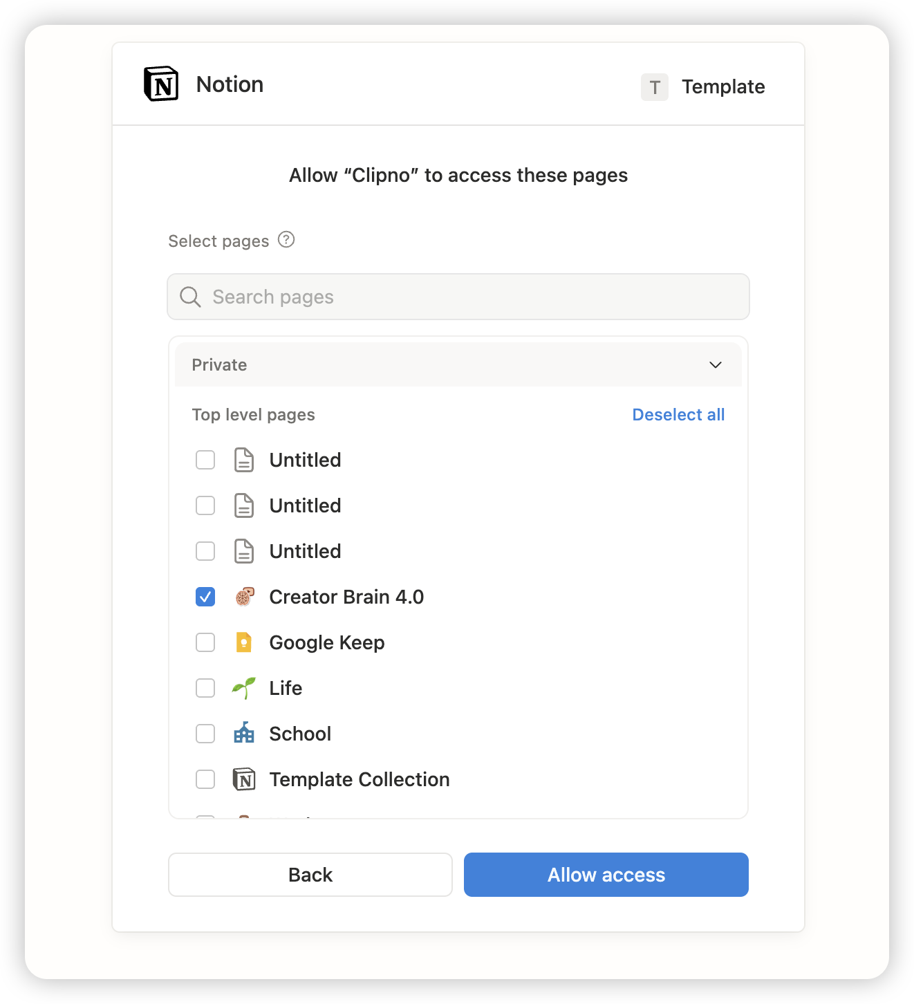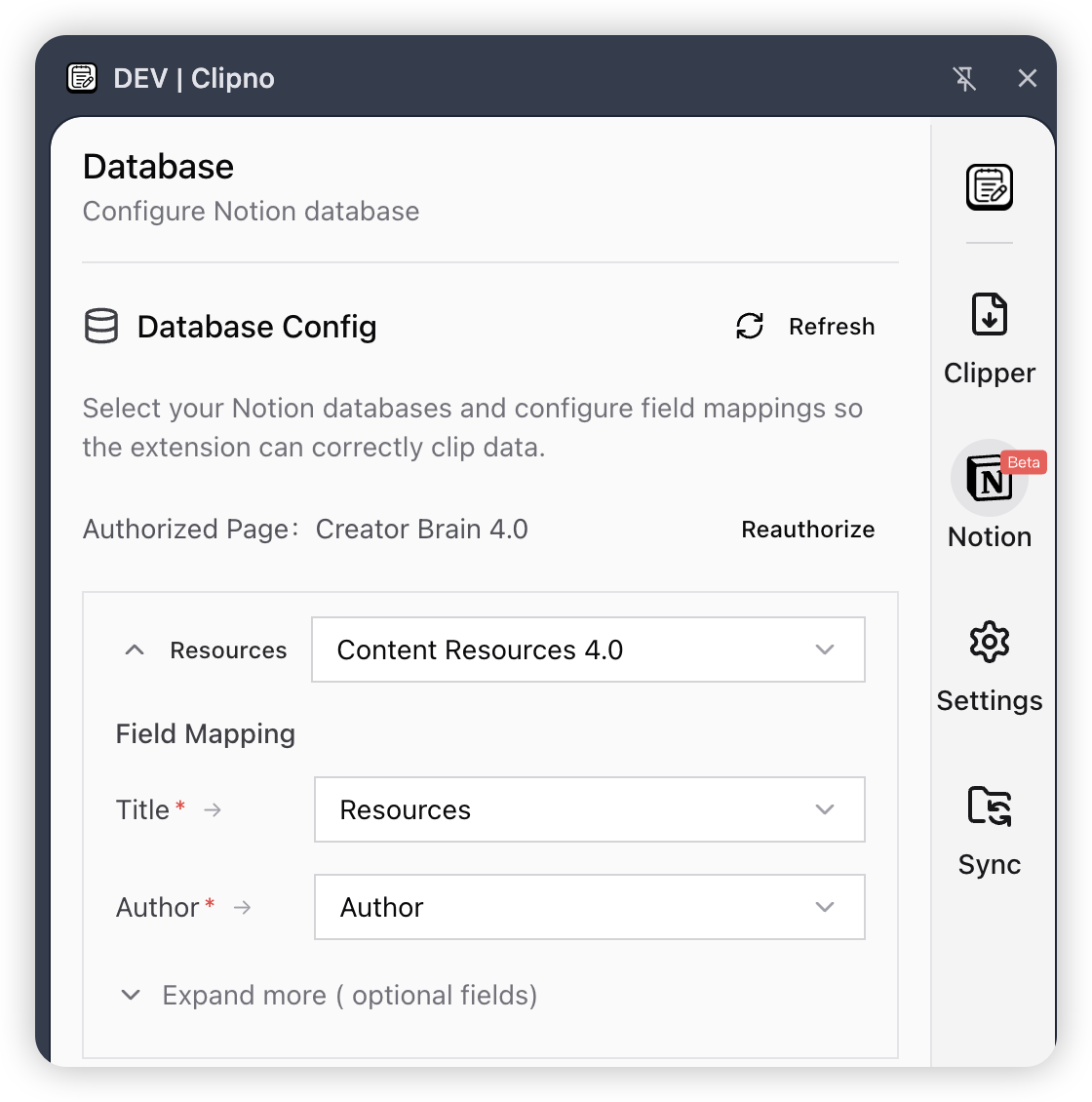 Tip: Put your template (or the database you save to) under a top‑level page in the Notion sidebar, and make sure the template already contains the resource database you want to use. This makes it much easier to find and select from Clipno.