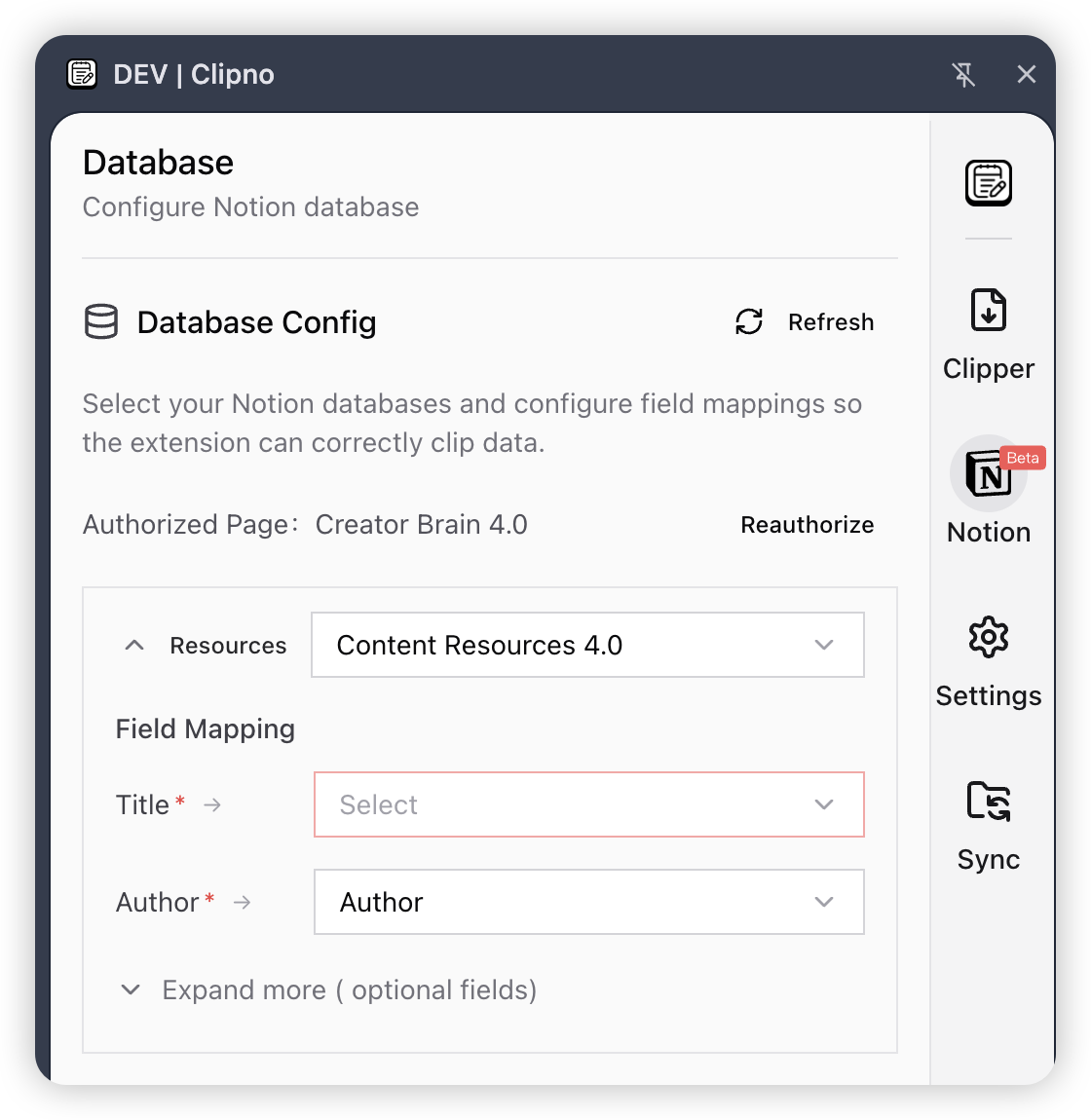 - Map fields: map properties in the database to the data from each clip. Title and Author are required; other fields (such as link, summary, etc.) are optional.